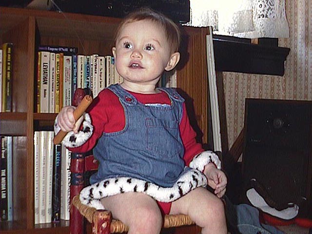 Sarah loves sitting in her chair and playing with the cat toy.