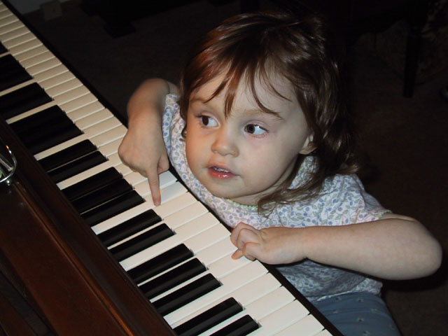 Sarah tickles the ivory on a visit to her great-grandmother's house.